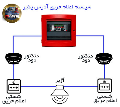 2. سیستم اعلام حریق آدرس پذیر (Addressable): یک سیستم اعلام حریق آدرس پذیر از مجموعه ای از آشکارساز های آتش و دستگاه هایی ساخته شده است که به یک صفحه کنترل مرکزی متصل می شوند. با استفاده از سیستم های آدرس پذیر، هر دستگاه دارای یک آدرس یا مکان است، که این امکان را می دهد تا آشکارساز دقیق مکان حریق ایجاد شده را به سرعت شناسایی کند. به عبارتی دیگر در سیستم اعلام حریق آدرس پذیر به طور دقیق دیوایسی که دچار حادثه شده است را مشخص می کند. به نوعی از سیستم اعلام حریق آدرس پذیر سیستم اعلام حریق هوشمند نیز گفته می شود.